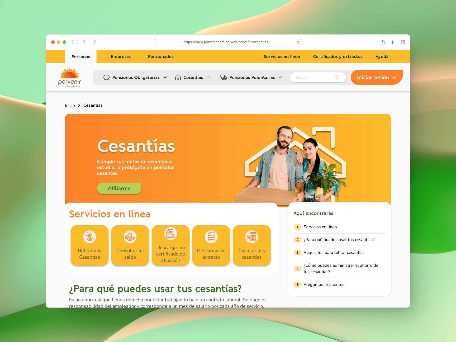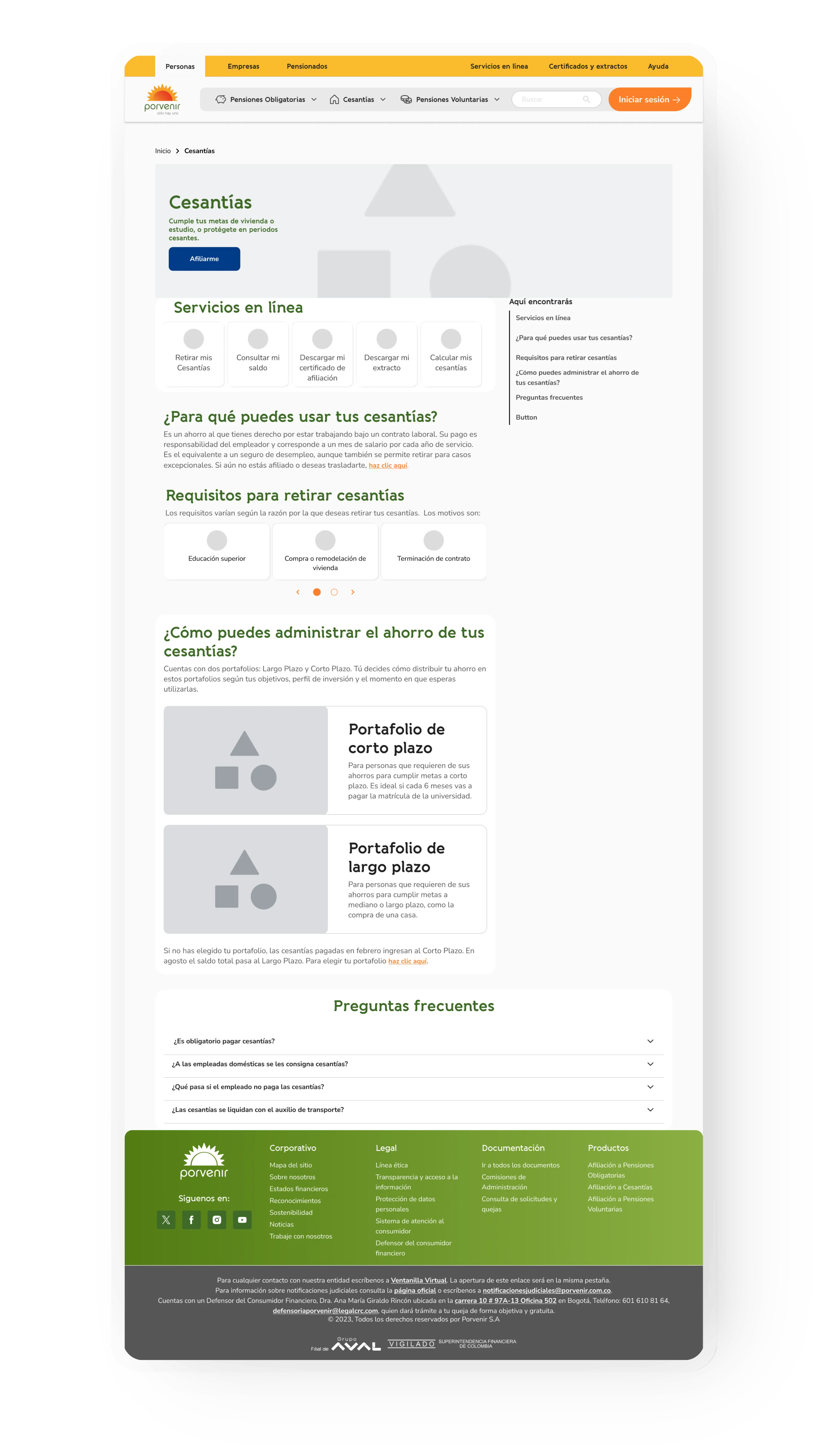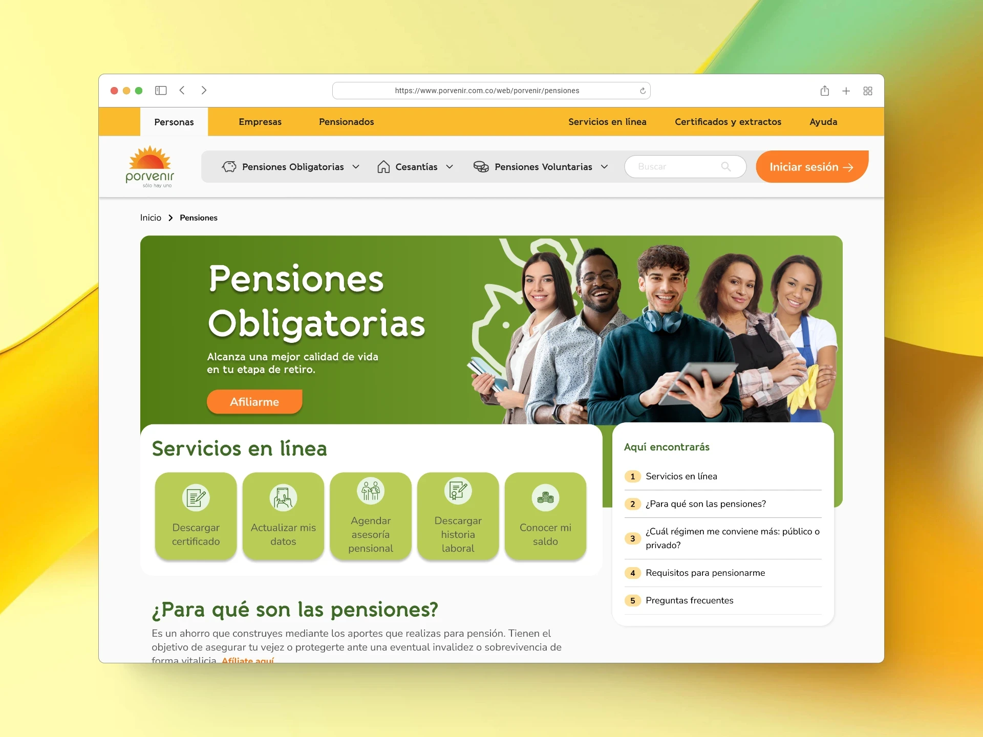 Porvenir is a Pension and Severance Fund Administrator. It has consolidated as the administrator with the largest number of affiliates and managed resources in said funds. In addition, it is part of the AVAL Group, one of the most important financial multinationals in the country.